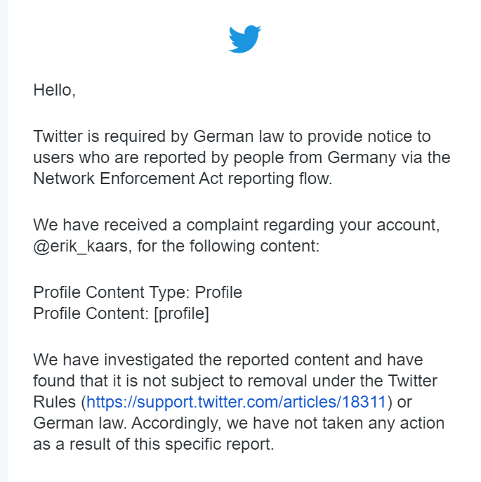 I literally got my profile reported this morning, and it turns out it's because she thinks I reported HER profile, based solely on the fact she got reported under German law (I live in Germany). I have never reported her account or tweets.pic.twitter.com/B4eX8lg1eI