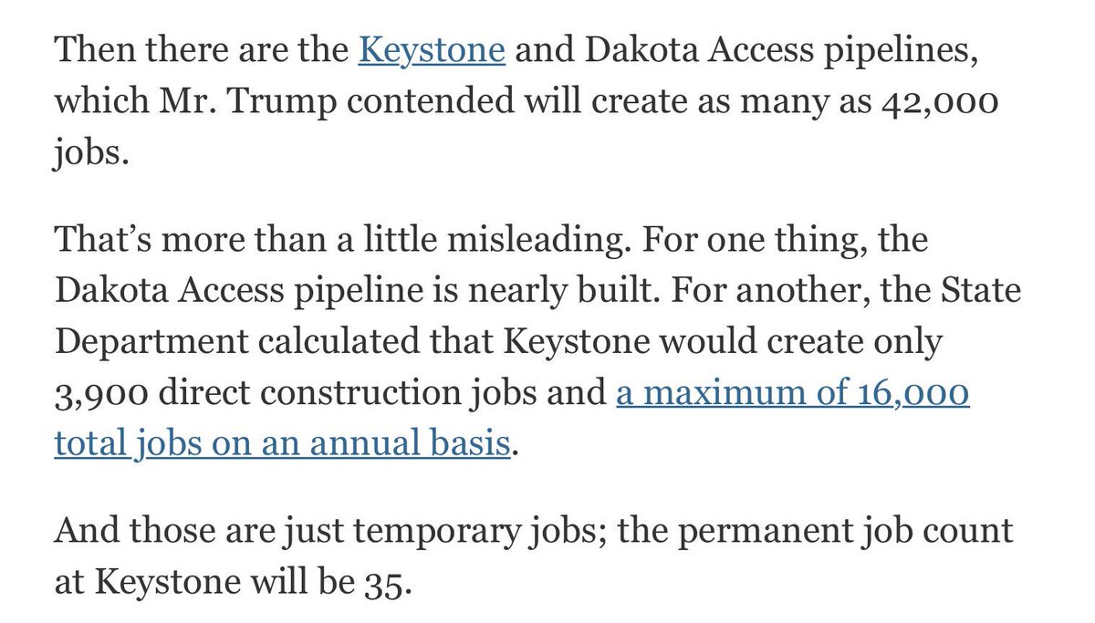 Trump repeats lie that Keystone/Dakota pipelines would create 42k jobs. False. We can expect only 35 permanent jobs. http://nyti.ms/2o696iC pic.twitter.com/QKY8I0YZin