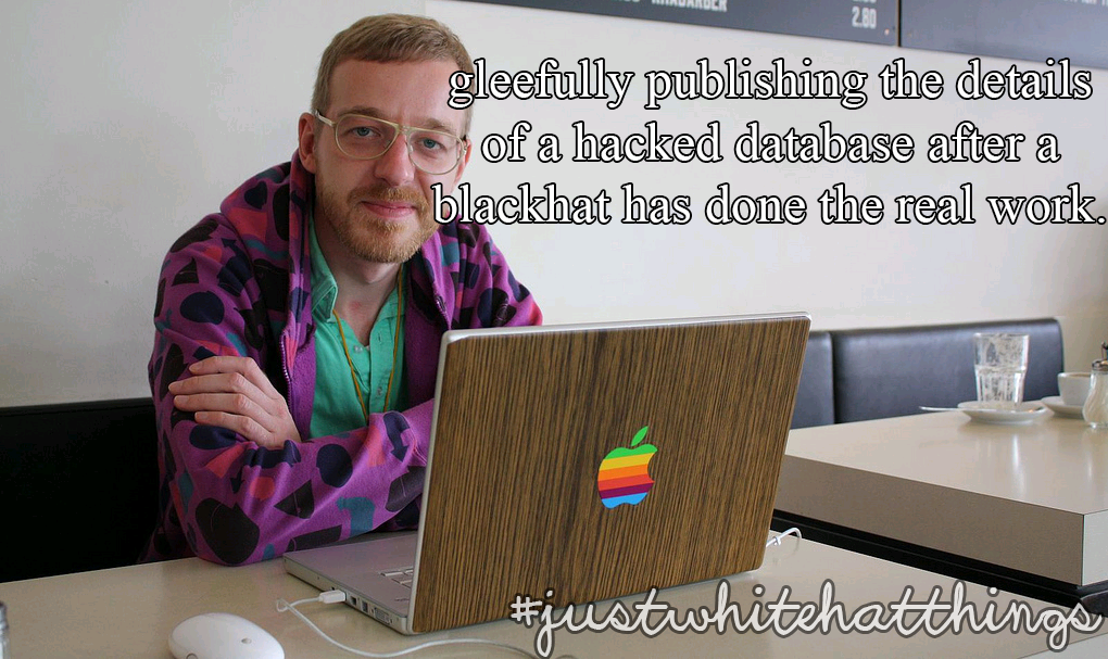 Gleefully publishing the details of a hacked database after a blackhat has done the real work.