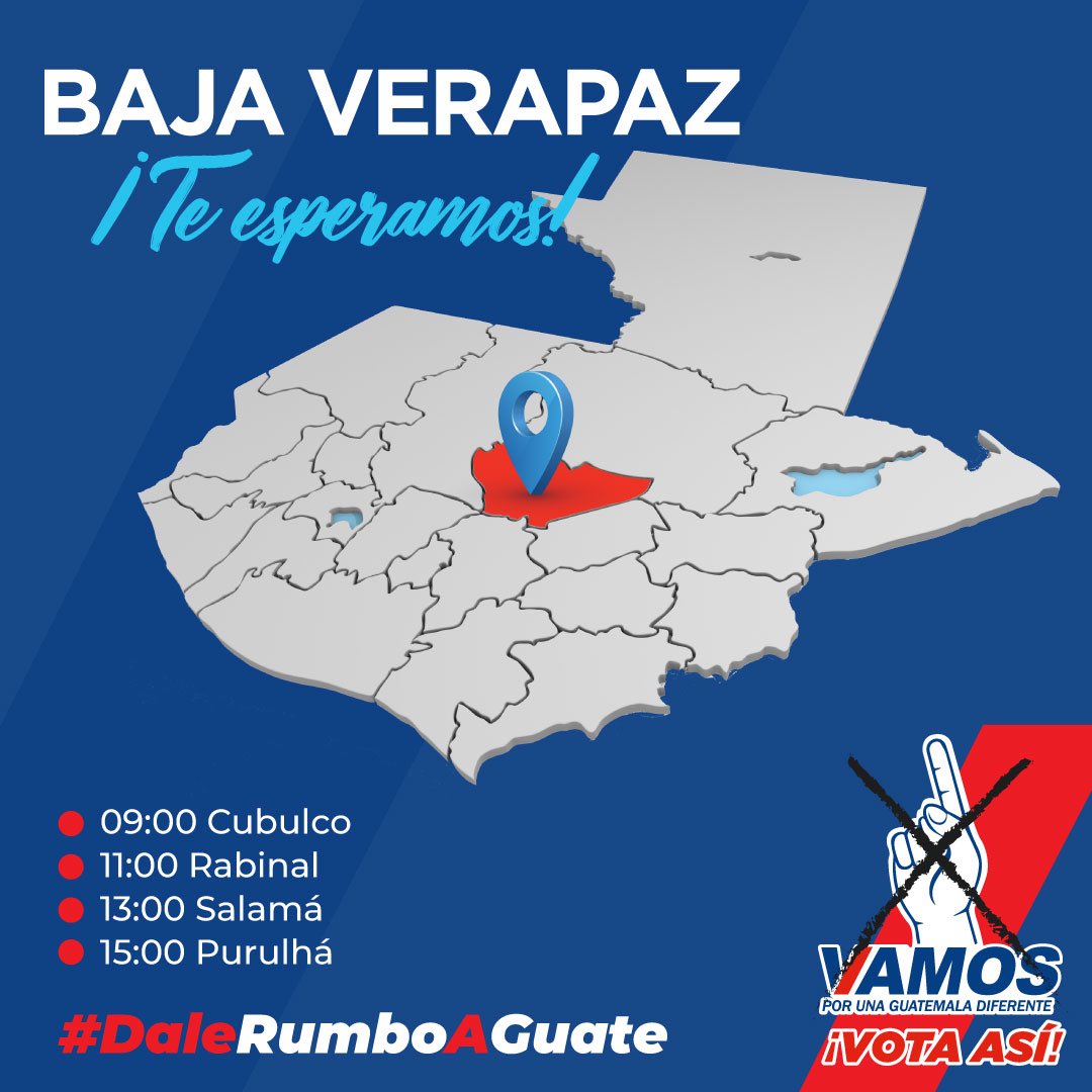 Seguimos recorriendo Guatemala, acompáñame hoy en Baja Verapaz ¡VAMOS por Guate! #VamosEnSerio ☝🏼 #VotaXVamos #DaleRumboAGuatepic.twitter.com/BD8uJImuEf