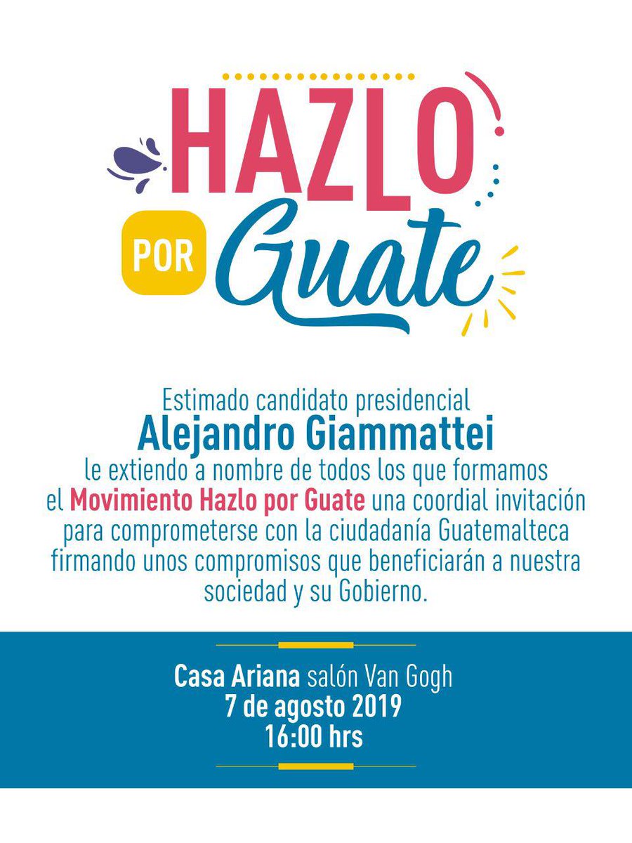Estimado candidato @DrGiammattei, desde #HazloPorGuate le extendemos una invitación para comprometerse con la ciudadanía guatemalteca, firmando unos compromisos que beneficiarán a nuestra sociedad.pic.twitter.com/mSMZryMiHF