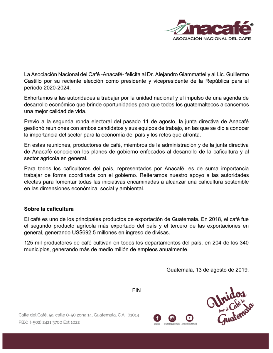 La Asociación Nacional del Café -Anacafé- felicita al Dr. Alejandro Giammattei (@DrGiammattei) y al Lic. Guillermo Castillo (@GuilleCastilloR) por su reciente elección como presidente y vicepresidente de la República para el período 2020-2024. #CafédeGuatemalapic.twitter.com/4a85lXezC9