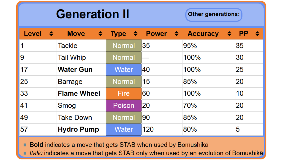 (3/4) The photo attached to this tweet is Bomushikā's learnset in Gold & Silver's 1997 demo. Naturally learning attacks like Flame Wheel and Hydro Pump, Bomushikā likely would have been quite a popular Pokemon... if he'd made it into Gold & Silver's final build.pic.twitter.com/XX4GYbO8wo