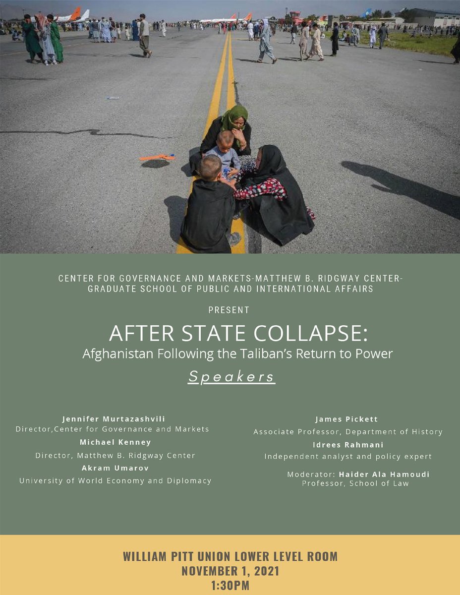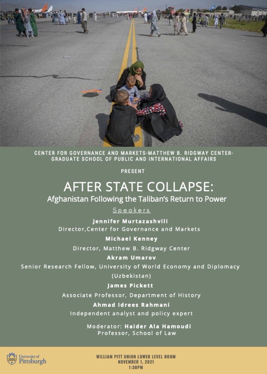 @Ridgway_Ctr@CGMPitt@GSPIA for a panel discussion on the state of Afghanistan after US withdraw and the Taliban’s return to power. Remember, this will be our first in-person event of 2021! See you Monday at 1:30pm in the lower level lounge of the William Pitt Union!pic.twitter.com/9S79zjNAaR