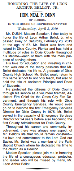 Recently, I was able to honor the life of Leon Arthur Bellot, Jr. a man who dedicated his life to serving others in Dixie County in the Congressional Record. Mr. Bellot passed away in February, but he will forever be remembered as a courageous educator, protector, and leader.pic.twitter.com/gEjZmD2ItR