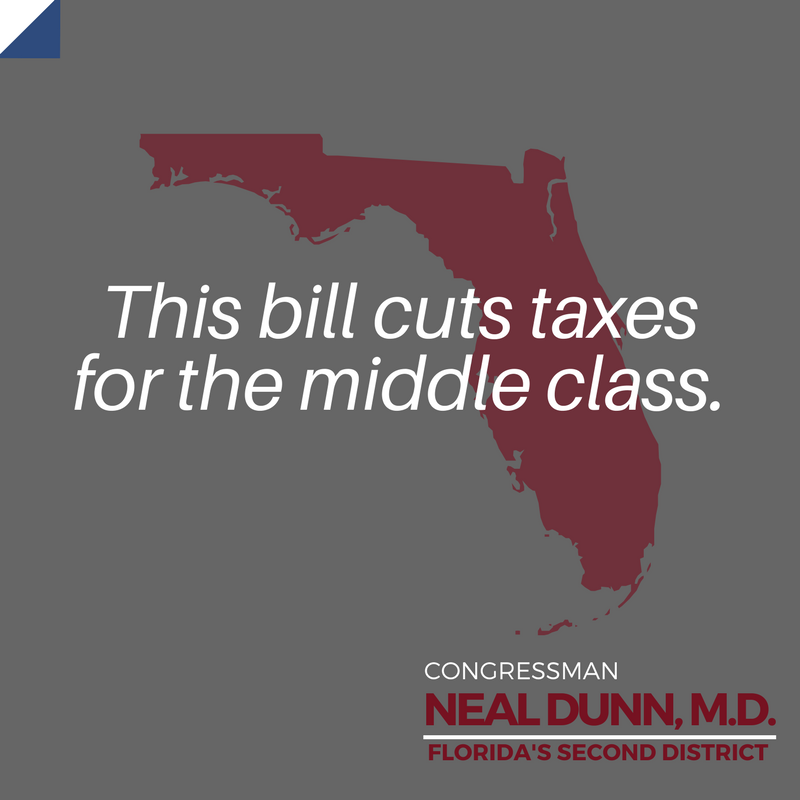 The bill cuts taxes for the middle class. The 15% bracket is cut to 12%. The 25% bracket is cut to 22%. The standard deduction (claimed by 81% of residents in Florida’s Second District) is roughly doubled to $12,000 for individuals and $24,000 for married couples.pic.twitter.com/uPecHyFcVz
