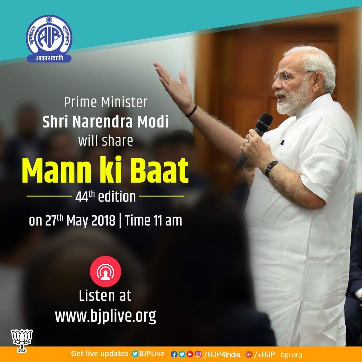 PM Shri @narendramodi Ji will share his thoughts on wide range of topics in #MannKiBaat today at 11 am. Tune in to hear it live on 'Narendra Modi App'. http://nm4.in/dnldapp .pic.twitter.com/7HWkJsr6GE