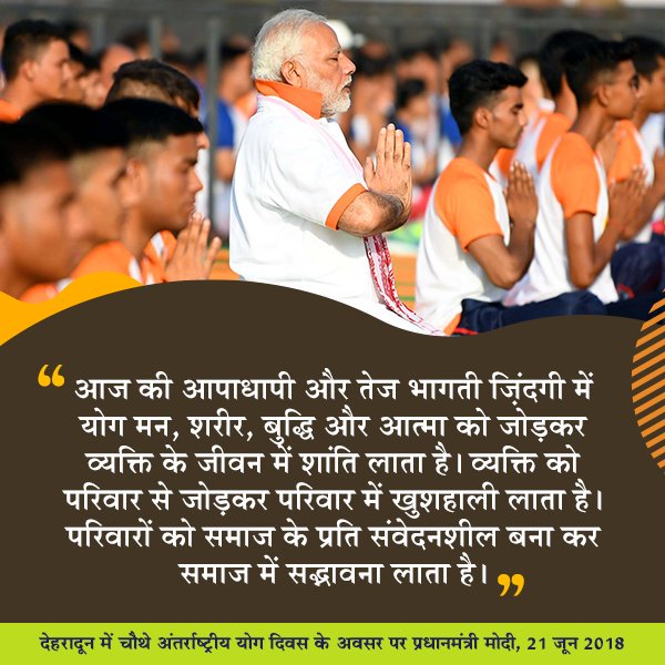 आज की आपाधापी और तेज़ भागती ज़िंदगी में योग मन, शरीर और बुद्धि आत्मा को जोड़कर व्यक्ति के जीवन में शांति लाता है। व्यक्ति को परिवार से जोड़कर परिवार में ख़ुशहाली लाता है। परिवारों को समाज के प्रति संवेदनशील बना कर समाज में सद्भावना लाता है: श्री @narendramodipic.twitter.com/0l98pO1Rxr