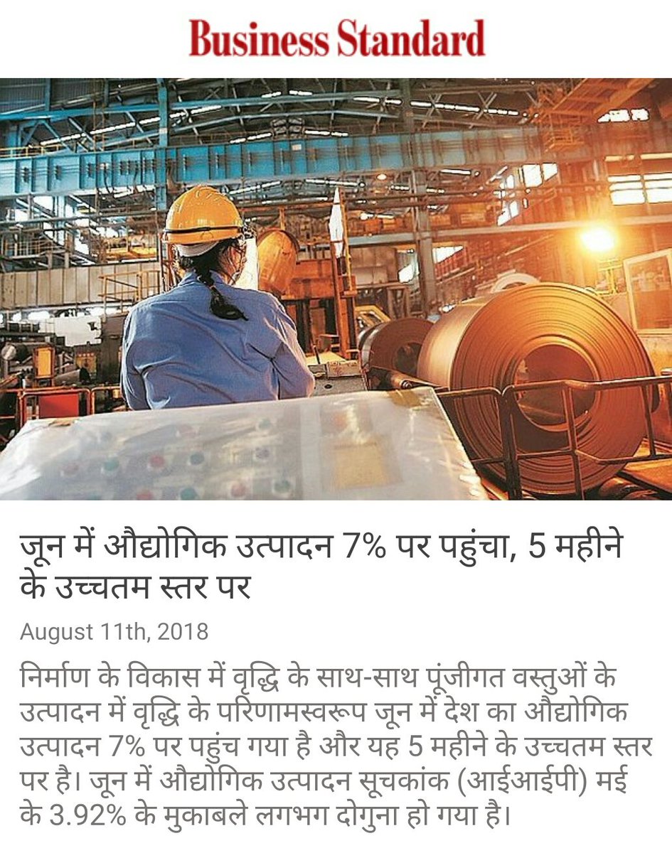 जून में औद्योगिक उत्पादन 7% पर पहुंचा, 5 महीने के उच्चतम स्तर पर https://www.business-standard.com/article/economy-policy/industrial-output-jumps-7-in-june-to-5-month-high-manufacturing-up-6-9-118081001451_1.html … via NaMo Apppic.twitter.com/YzYFUJcjnP
