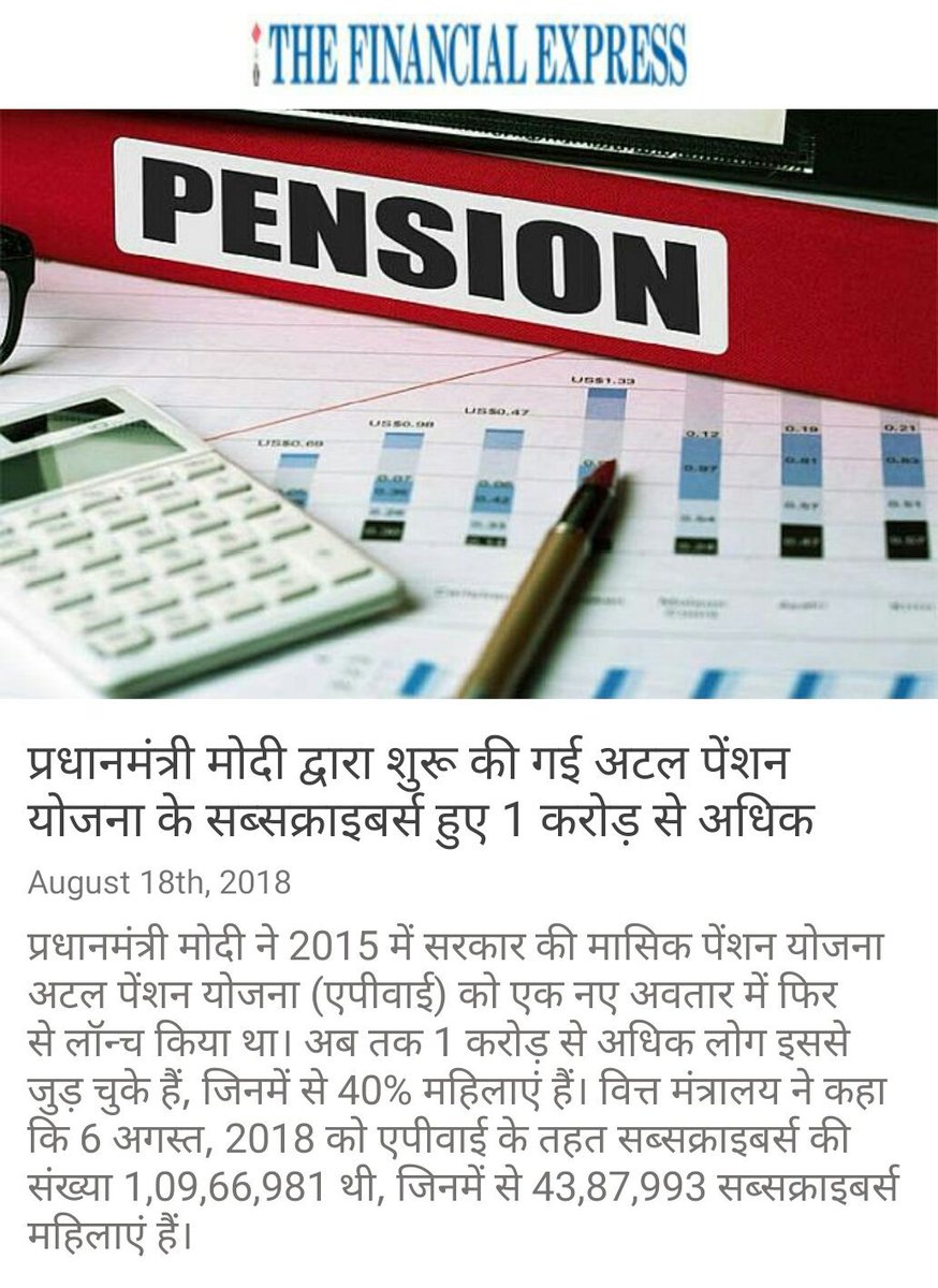 प्रधानमंत्री मोदी द्वारा शुरू की गई अटल पेंशन योजना के सब्सक्राइबर्स हुए 1 करोड़ से अधिक https://www.financialexpress.com/economy/modis-atal-pension-yojana-subscriber-base-crosses-1-crore-and-40-are-women-what-you-should-know/1283776/ … via NaMo Apppic.twitter.com/pIzY8VQjub