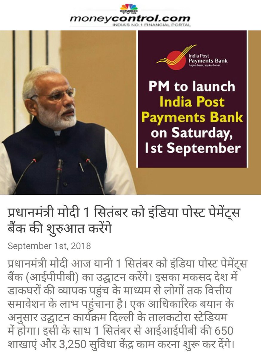 प्रधानमंत्री मोदी 1 सितंबर को इंडिया पोस्ट पेमेंट्स बैंक की शुरुआत करेंगे https://www.moneycontrol.com/news/india/pm-narendra-modi-to-launch-india-post-payments-bank-on-september-1-2902741.html … via NaMo Apppic.twitter.com/3zvgYTEgPg