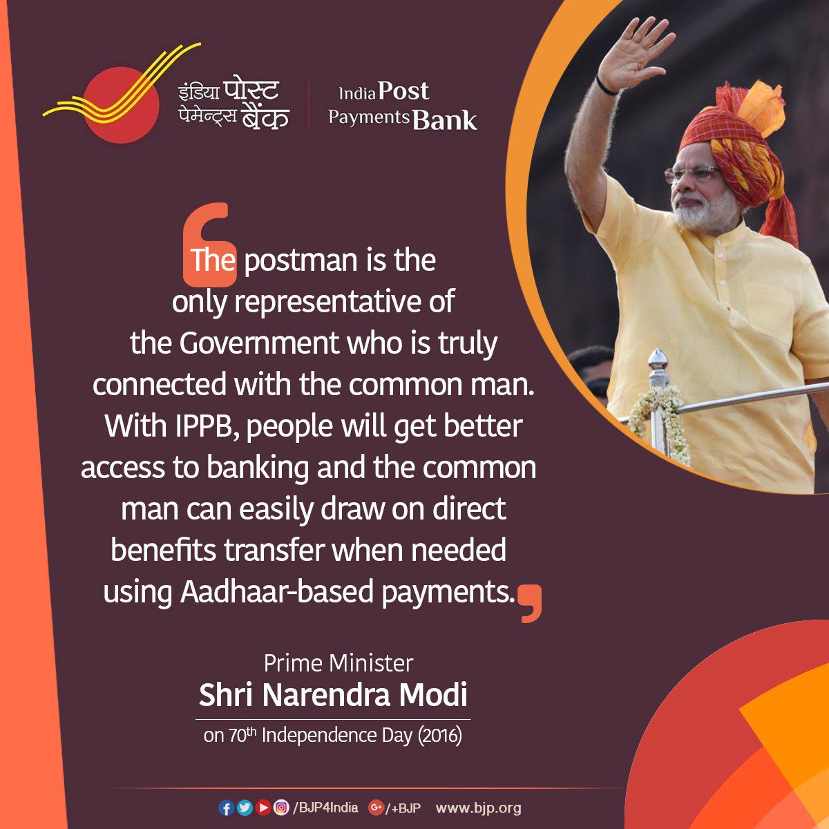 The postman is the only representative of the govt. who is truly connected with the common man. With IPPB, people will get better access to banking and the common man can easily draw on direct benefits transfer when needed using aadhaar based payments : PM #IndiaPostPaymentsBankpic.twitter.com/dx4MGLzwsp
