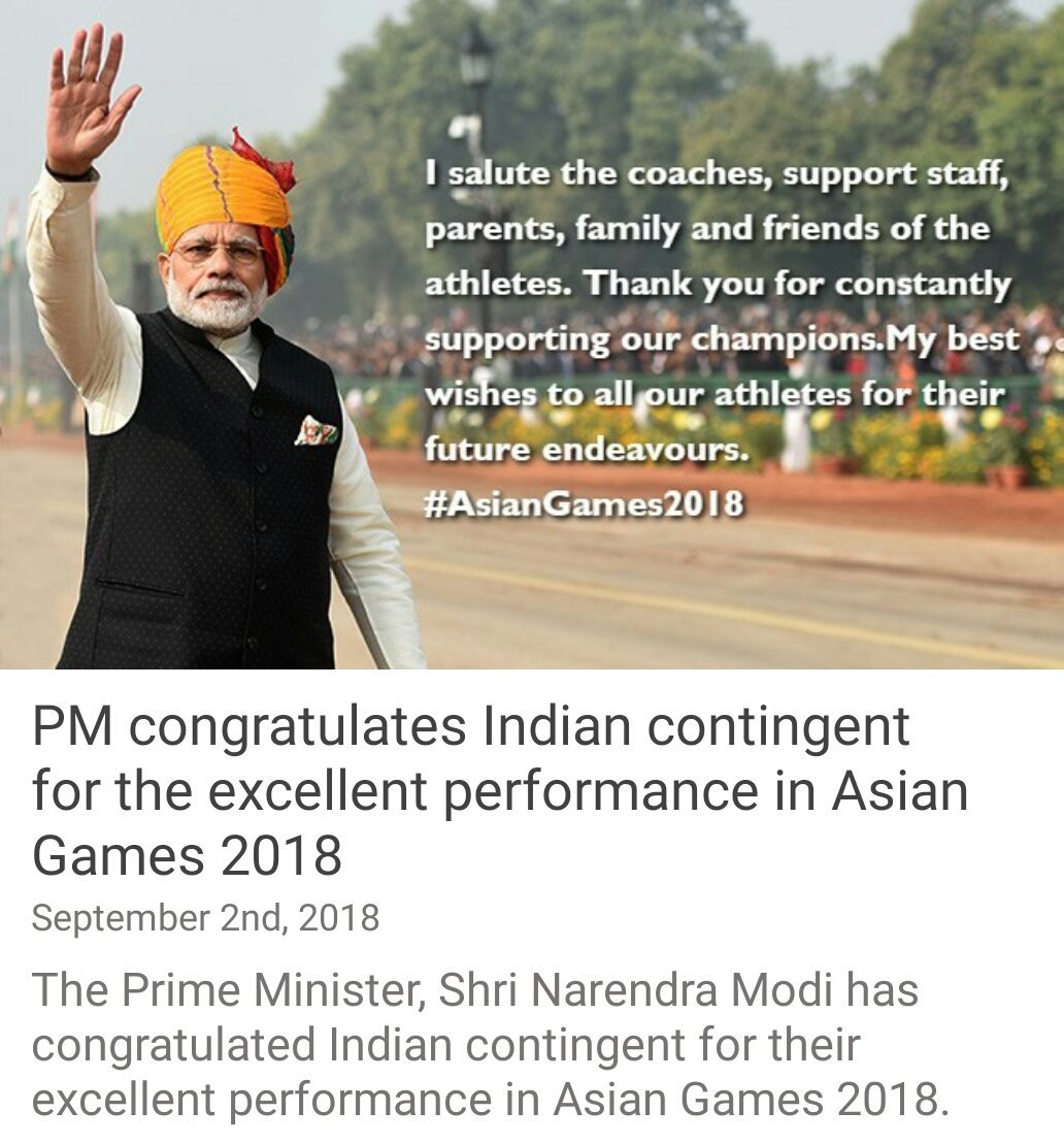 PM congratulates Indian contingent for the excellent performance in Asian Games 2018 http://nm-4.com/gvu6 via NaMo Apppic.twitter.com/73I1BCtE7q
