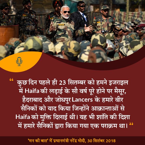 We recently celebrated 100 years of the Haifa War of Israel on 23 September, we remembered the brave soldiers of Mysore, Hyderabad & Jodhpur Lancers who liberated Haifa: PM Shri @narendramodi #MannKiBaatpic.twitter.com/GlcookyUVB