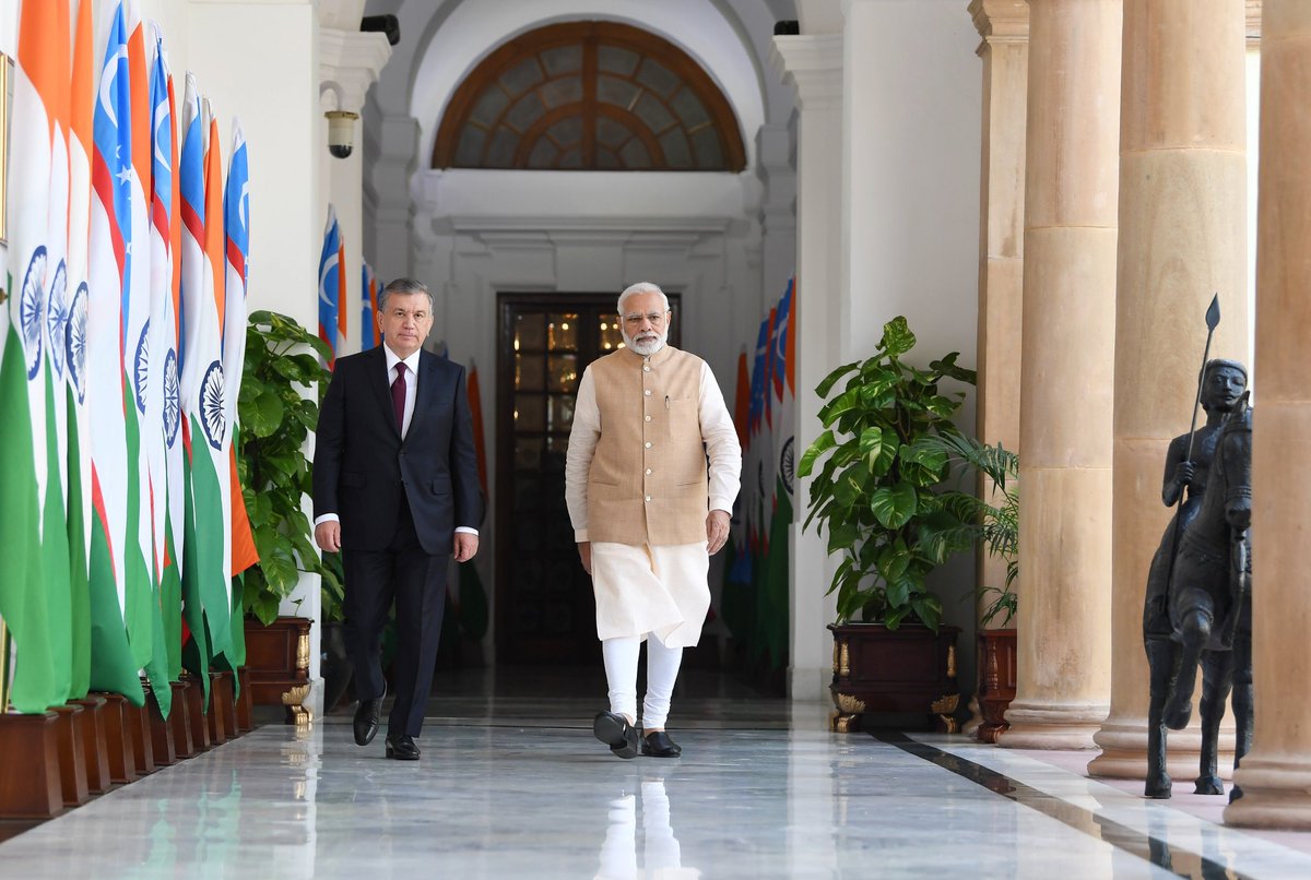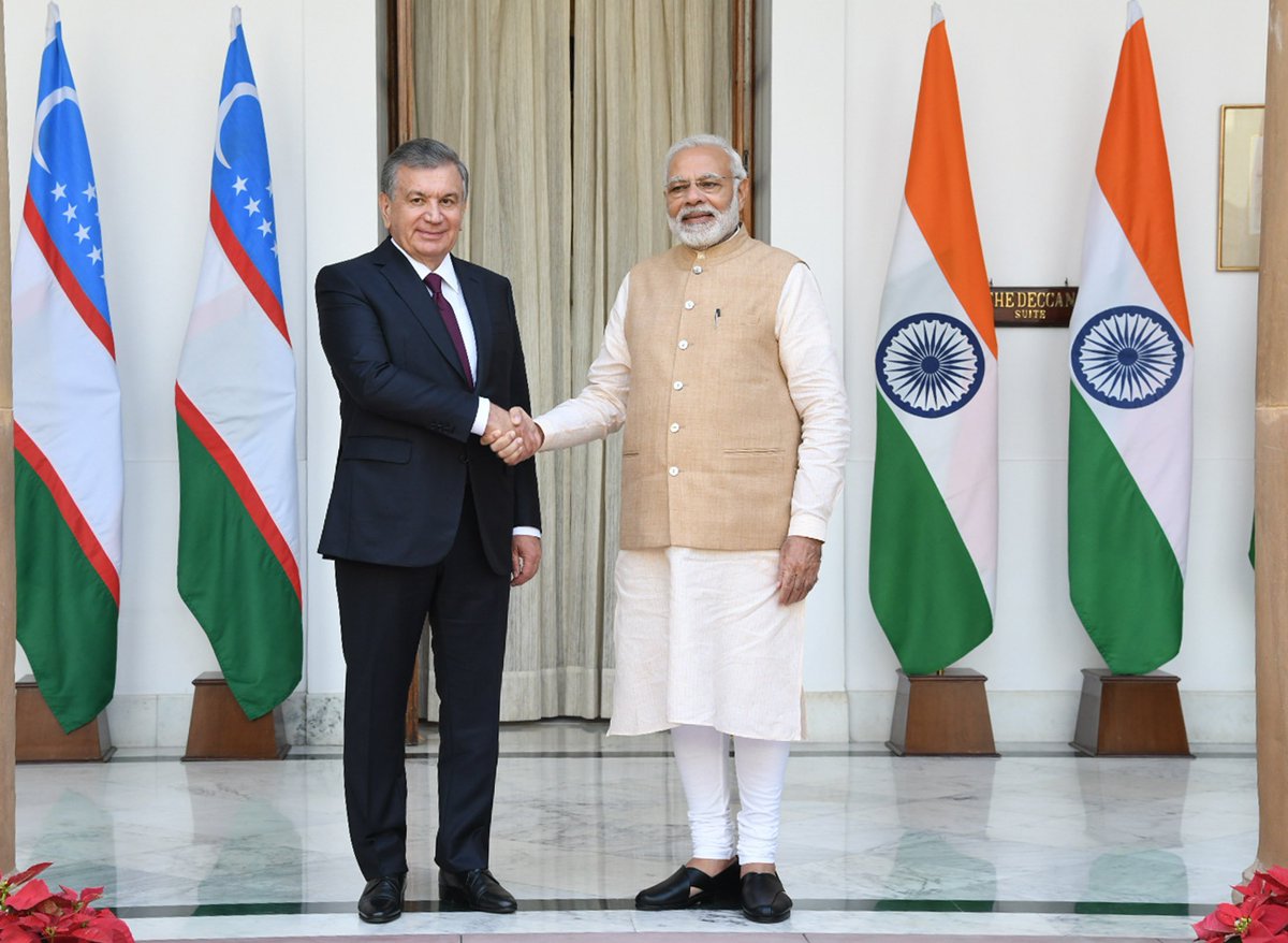 PM @narendramodi meeting with @president_uz Shavkat Mirziyoyev at Hyderabad House in New Delhi. #UzbekIndiapic.twitter.com/QbOZHa56hw