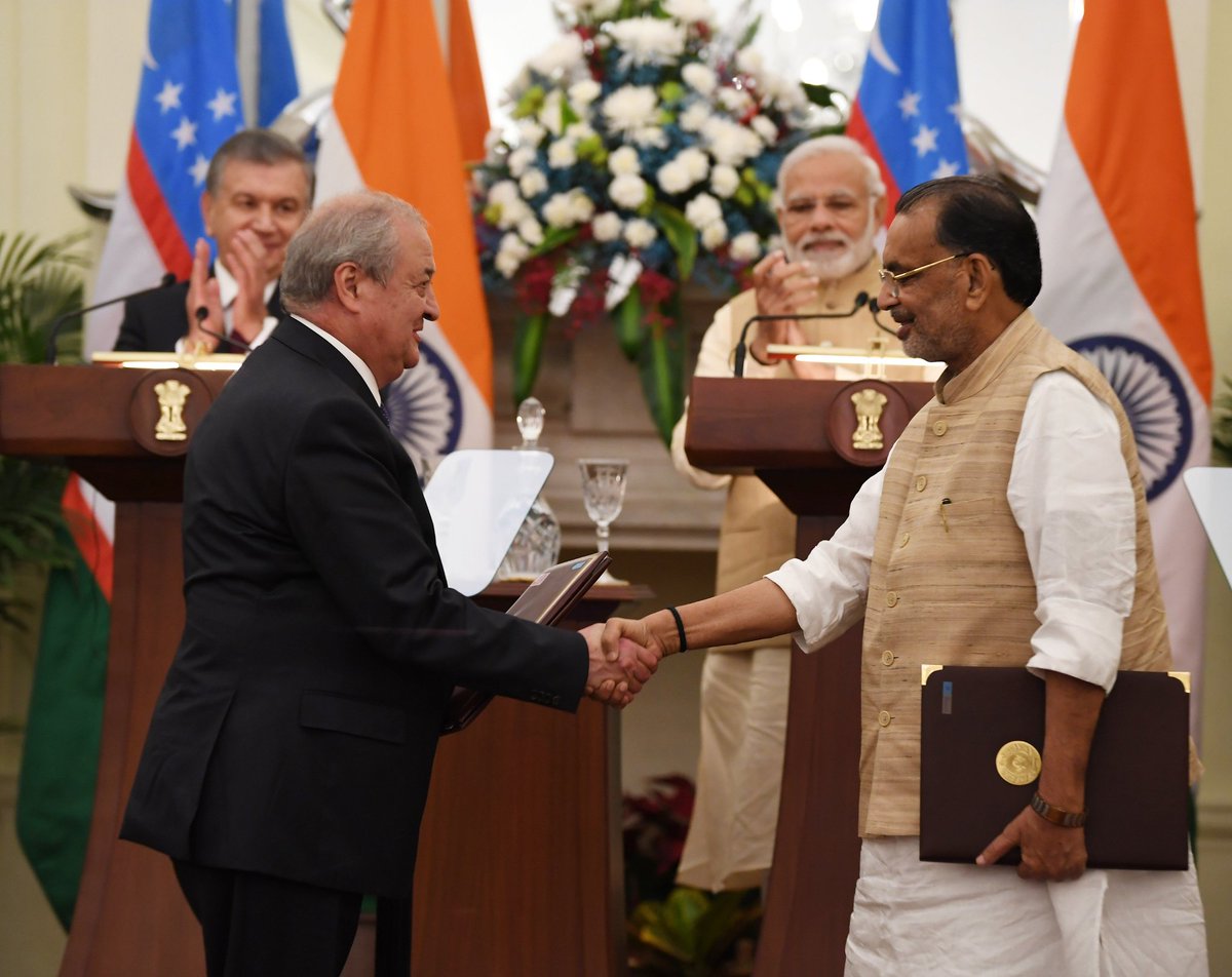 PM @narendramodi and President of Uzbekistan Mr. Shavkat Mirziyoyev witnessing the Exchange of Agreements at Hyderabad House in New Delhi .