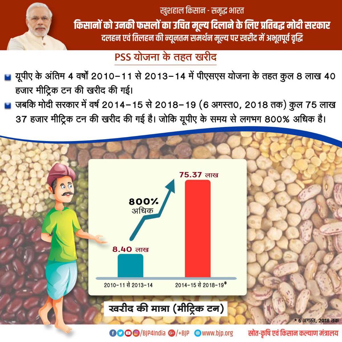 किसानों को उनकी फसलों का उचित मूल्य दिलाने के लिए प्रतिबद्ध मोदी सरकार, पिछले 4 सालों में PSS योजना के तहत दलहन एवं तिलहन की न्यूनतम समर्थन मूल्य पर खरीद में अभूतपूर्व वृद्धि आई है।pic.twitter.com/m88fM4HVP7