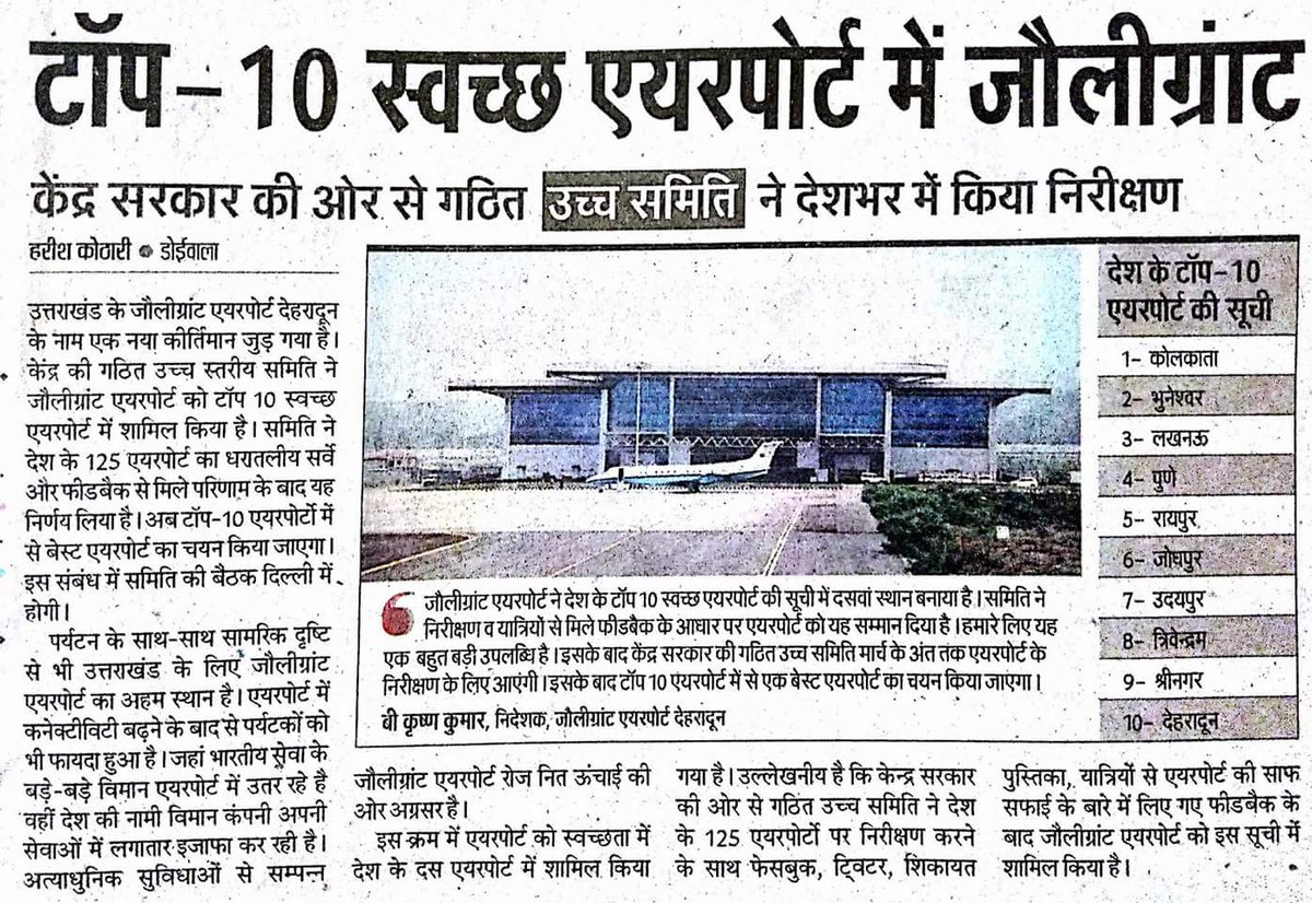 यह बहुत हर्ष और गर्व की बात है की जोलीग्रांट एयरपोर्ट को स्वच्छता के लिए टॉप टेन सूची में शामिल किया गया है | #स्वच्छ_भारतpic.twitter.com/fjm79PRqLM