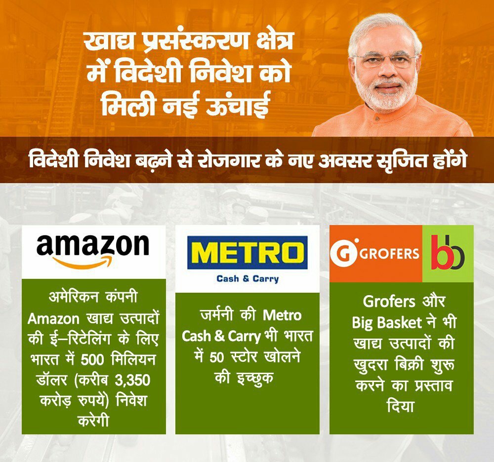 खाद्य प्रसंस्करण क्षेत्र में विदेशी निवेश को मिली नई ऊंचाई - विदेशी निवेश बढने से रोज़गार के नए अवसर सृजित होंगे। #TransformingIndiapic.twitter.com/ZpVwgHSUxb
