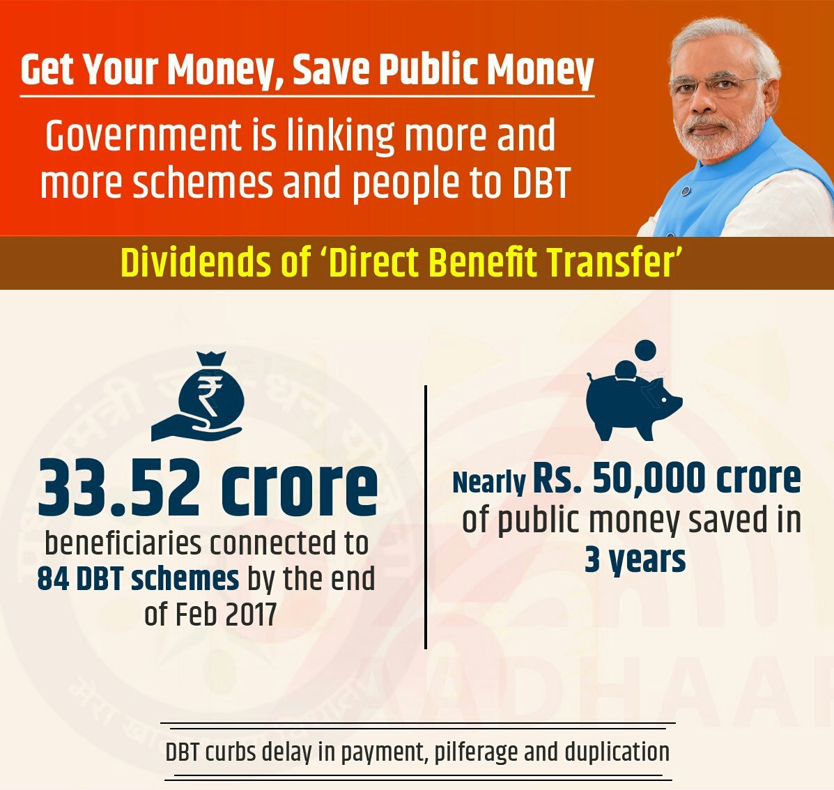 Dividend of #DBT : 33.52 crore beneficiaries linked to 84 schemes by Feb 2017 with savings of Rs 50,000 crore public money in 3 years.pic.twitter.com/TXiZFeborJ