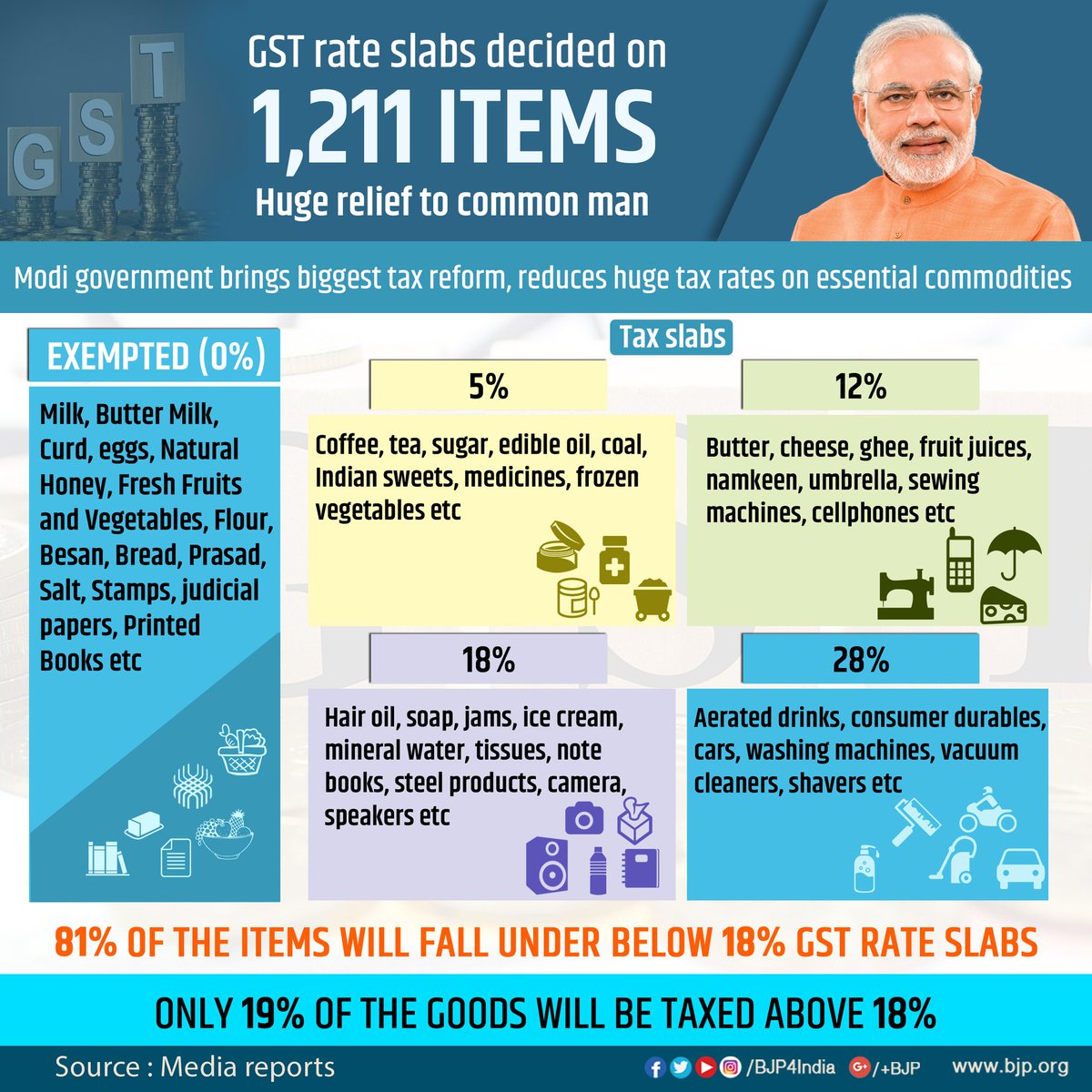 #GST rate slabs decided on 1,211 items, bringing huge relief to common man by reducing taxes on essential commodities.pic.twitter.com/ldtbzEEftk