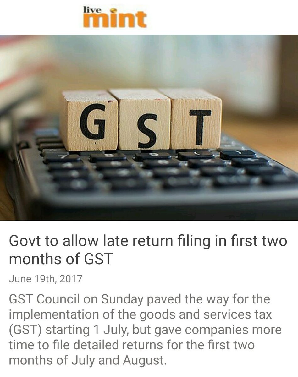 Govt to allow late return filing in first two months of GST http://www.livemint.com/Politics/DVZsrmjEFRKvDvXchkJaMN/Govt-to-allow-late-filing-in-first-two-months-of-GST.html … via NMApppic.twitter.com/biJrssLro4