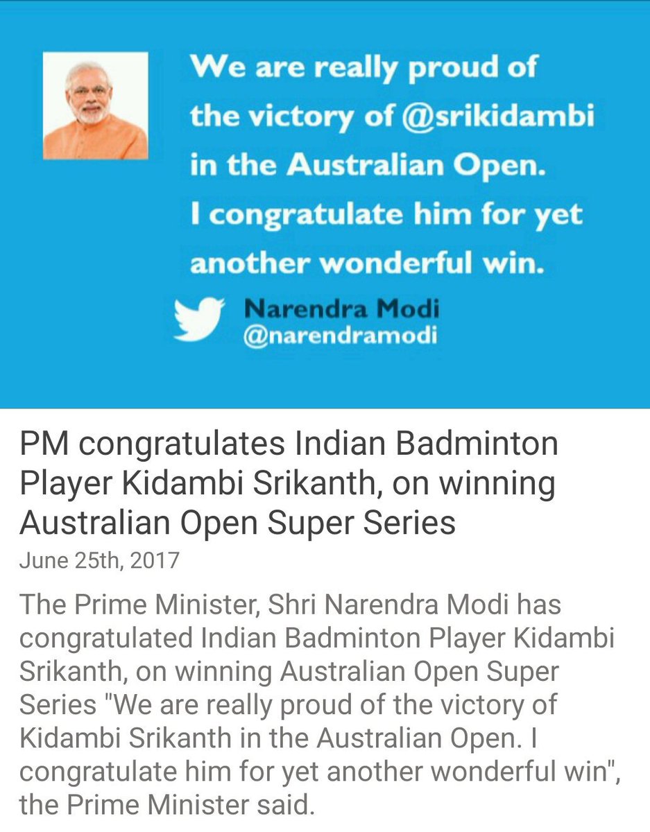 PM congratulates Indian Badminton Player Kidambi Srikanth, on winning Australian Open Super Series http://nm-4.com/mm24 via NMApppic.twitter.com/1gIBZlqCrx