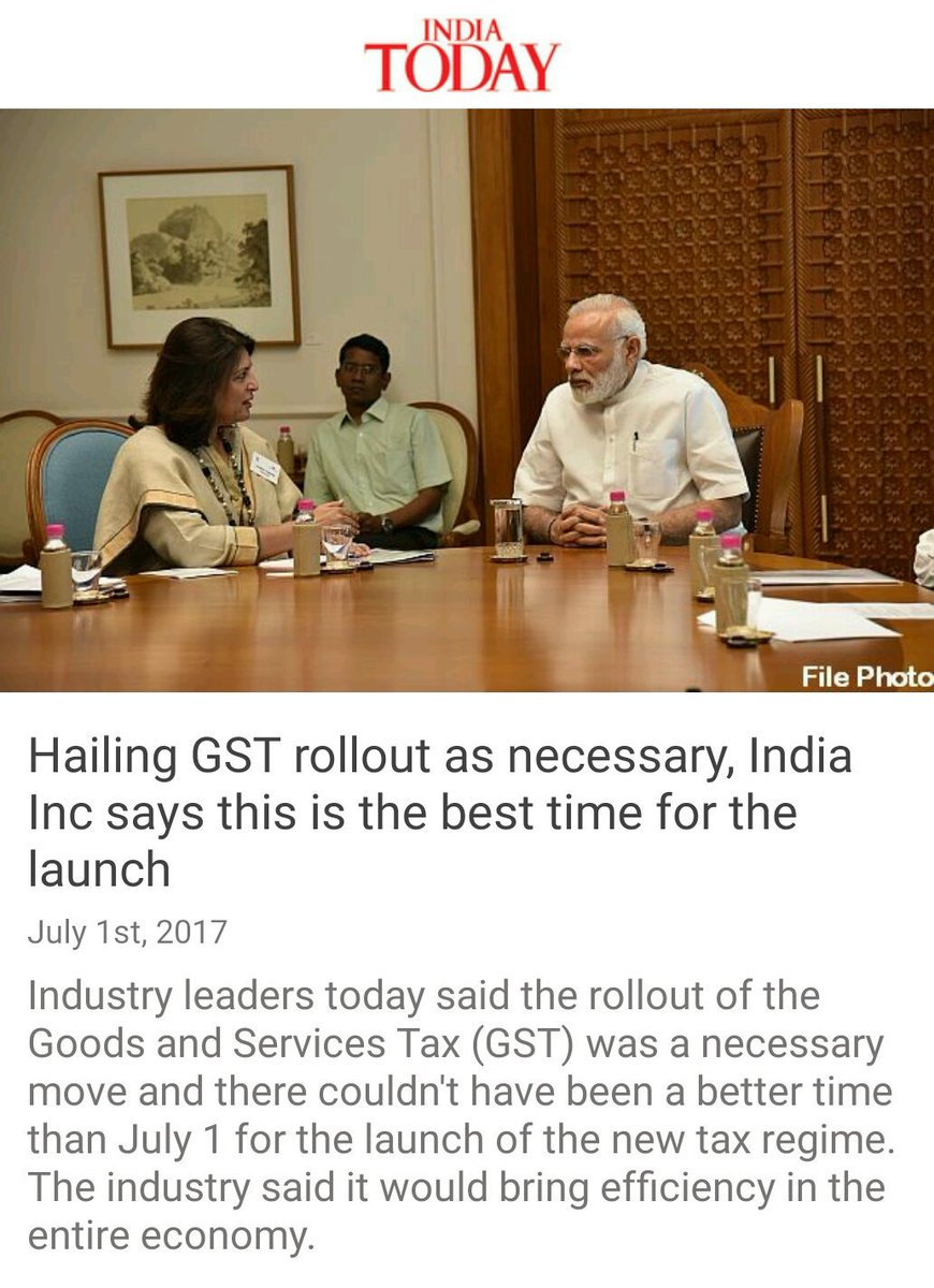 Hailing GST rollout as necessary, India Inc says this is the best time for the launch http://indiatoday.intoday.in/story/gst-launch-midnight-conclave-parliament-indian-industry-leaders/1/991307.html … via NMApppic.twitter.com/MTGiHuPl1d