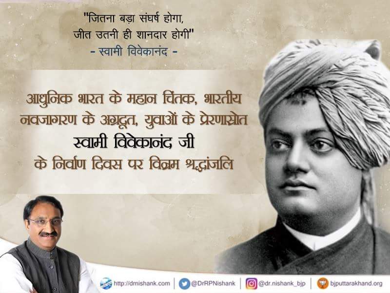 आधुनिक भारत के महान चिंतक, भारतीय नवजागरण के अग्रदूत, युवाओं के प्रेरणास्रोत स्वामी विवेकानंद जी के निर्वाण दिवस पर विन्रम श्रद्धांजलि |pic.twitter.com/ENrPYh6Vs2