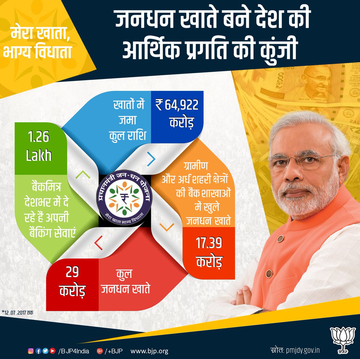 जनधन खाते बने देश की आर्थिक प्रगति की कुंजी : जनधन योजना के अंतर्गत 64,922 रुपये की जमाराशि के साथ 29 करोड़ बैंक खाते खोले गए।pic.twitter.com/qBGbPWvQCO