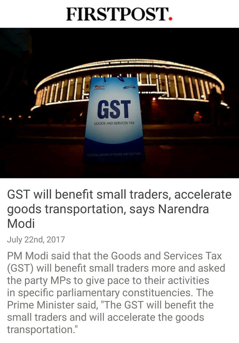 GST will benefit small traders, accelerate goods transportation, says Narendra Modi http://www.firstpost.com/india/gst-will-benefit-small-traders-accelerate-goods-transportation-says-narendra-modi-3839649.html … via NMApppic.twitter.com/SYazCuL5Ib