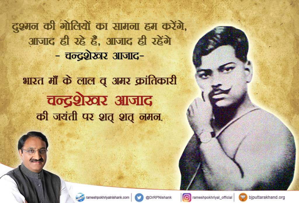 #ChandraShekharAzad भारत मां के लाल अमर क्रांतिकारी चंद्रशेखर आजाद की जयंती पर शत् शत् नमन |pic.twitter.com/GaxoKlwRpu