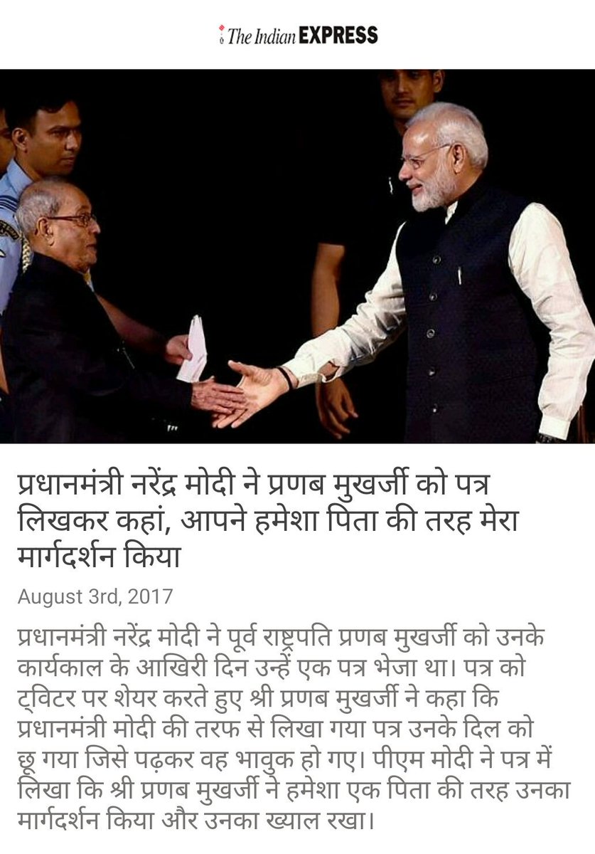 प्रधानमंत्री नरेंद्र मोदी ने प्रणब मुखर्जी को पत्र लिखकर कहां, आपने हमेशा पिता की तरह मेरा मार्गदर्शन किया via NMApppic.twitter.com/MeGWwQHxmy