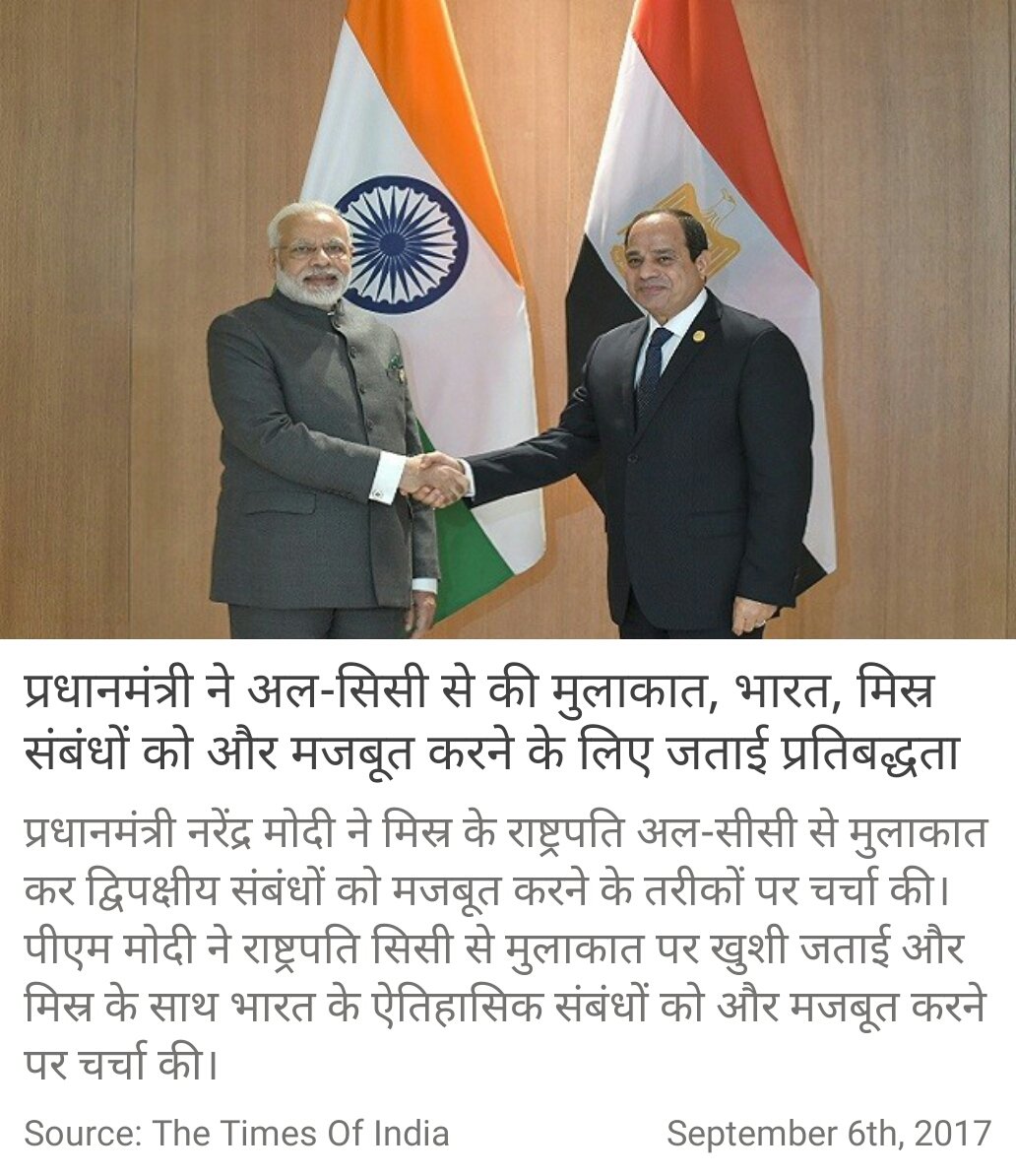 प्रधानमंत्री ने अल-सिसी से की मुलाकात, भारत, मिस्र संबंधों को और मजबूत करने के लिए जताई प्रतिबद्धता http://timesofindia.indiatimes.com/india/india-egypt-vow-to-strengthen-ties-as-modi-meets-sisi/articleshow/60376857.cms … via NMApppic.twitter.com/njQ81o0bzy