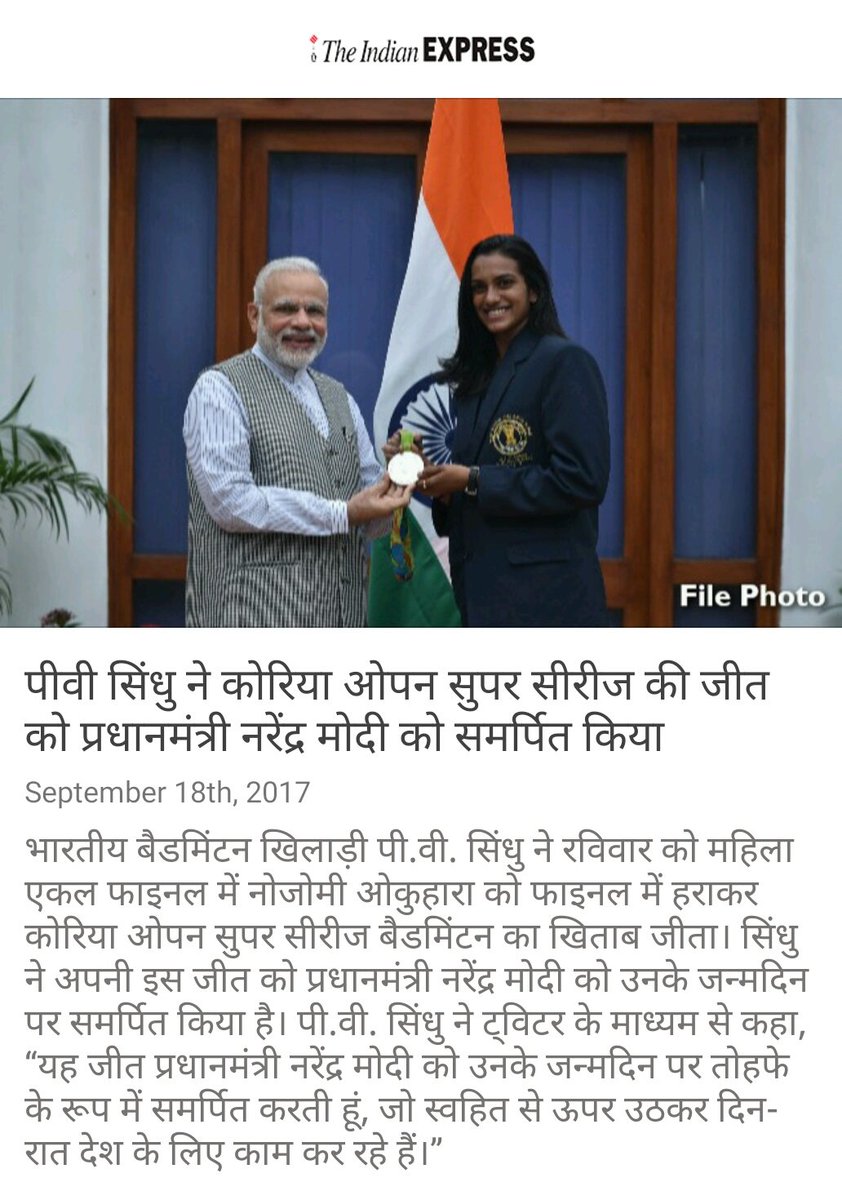 पीवी सिंधु ने कोरिया ओपन सुपर सीरीज की जीत को प्रधानमंत्री नरेंद्र मोदी को समर्पित किया http://indianexpress.com/article/sports/badminton/pv-sindhu-dedicates-korea-open-superseries-victory-to-beloved-prime-minister-narendra-modi-4848172/ … via NMApppic.twitter.com/pkwVd5uwPo