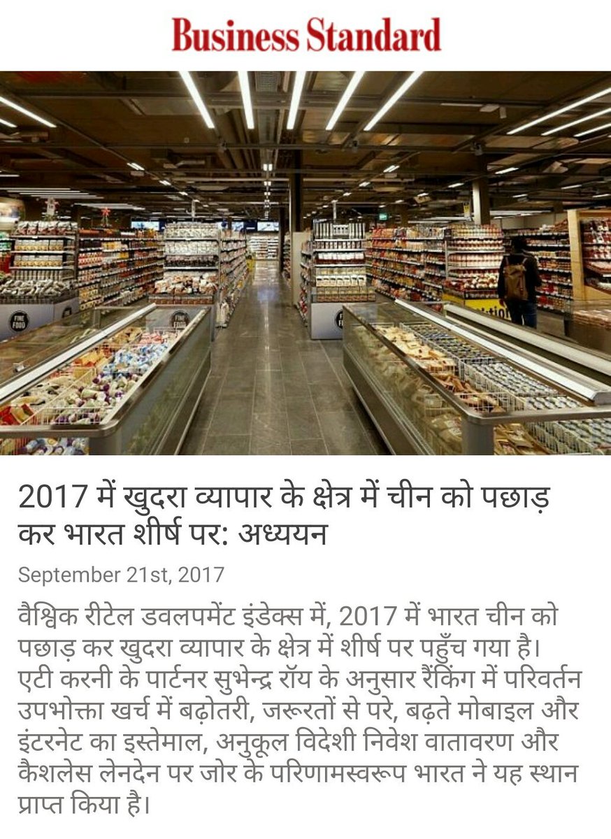 2017 में खुदरा व्यापार के क्षेत्र में चीन को पछाड़ कर भारत शीर्ष पर: अध्ययन http://www.business-standard.com/article/economy-policy/india-replaces-china-as-top-retail-destination-in-2017-study-117092000865_1.html … via NMApppic.twitter.com/FuZflcAJ55