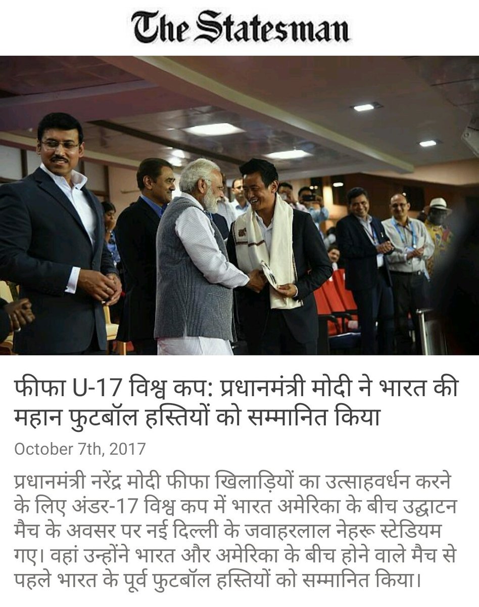 फीफा U-17 विश्व कप: प्रधानमंत्री मोदी ने भारत की महान फुटबॉल हस्तियों को सम्मानित किया http://www.thestatesman.com/india/fifa-u-17-world-cup-pm-modi-honours-india-football-legends-1502506715.html … via NMApppic.twitter.com/QTKvdX6RS0