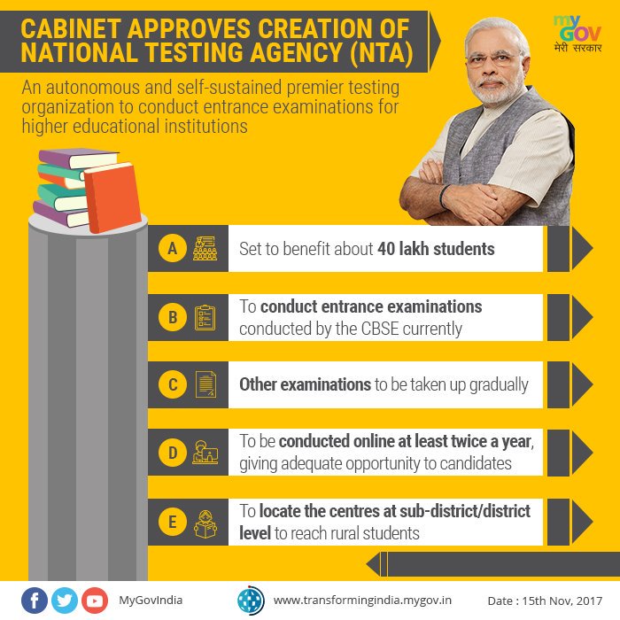 Cabinet approves creation of National Testing Agency, an autonomous and premier organization to conduct entrance examinations for higher education institutions https://transformingindia.mygov.in/all-infographics/ … #TransformingIndiapic.twitter.com/vBChQ2Vq40