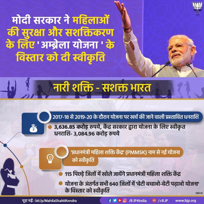 मोदी सरकार ने महिलाओं की सुरक्षा और सशक्तिकरण के लिए 'अम्ब्रेला योजना' के विस्तार के लिए वर्ष 2019-20 तक 3,636.85 करोड़ रुपये स्वीकृत किए, 115 पिछड़े जिलों में खोले जायेंगे प्रधनामंत्री महिला शक्ति केंद्र।pic.twitter.com/cSjQcFzFX2