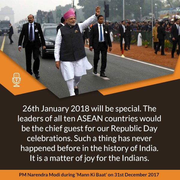 India looks forward to welcoming ASEAN leaders for #RepublicDay 2018 celebrations. This is the first time so many leaders will grace the celebrations as the Chief Guests: PM #MannKiBaatpic.twitter.com/dbniznY4tl