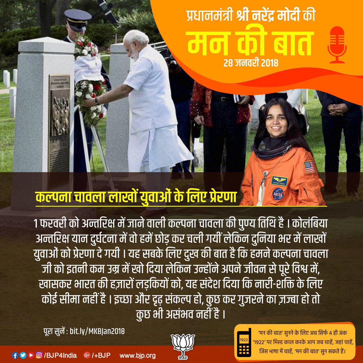 1 फरवरी को अन्तरिक्ष में जाने वाली कल्पना चावला की पुण्य तिथि है। उन्होंने अपने जीवन से पूरे विश्व में, खासकर भारत की हजारों लड़कियों को, यह संदेश दिया कि नारी-शक्ति के लिए कोई सीमा नहीं है। इच्छा और दृढ़ संकल्प हो, कुछ कर गुजरने का जज्बा हो तो कुछ भी असंभव नहीं है : पीएम मोदीpic.twitter.com/DDb7c4KQ7P
