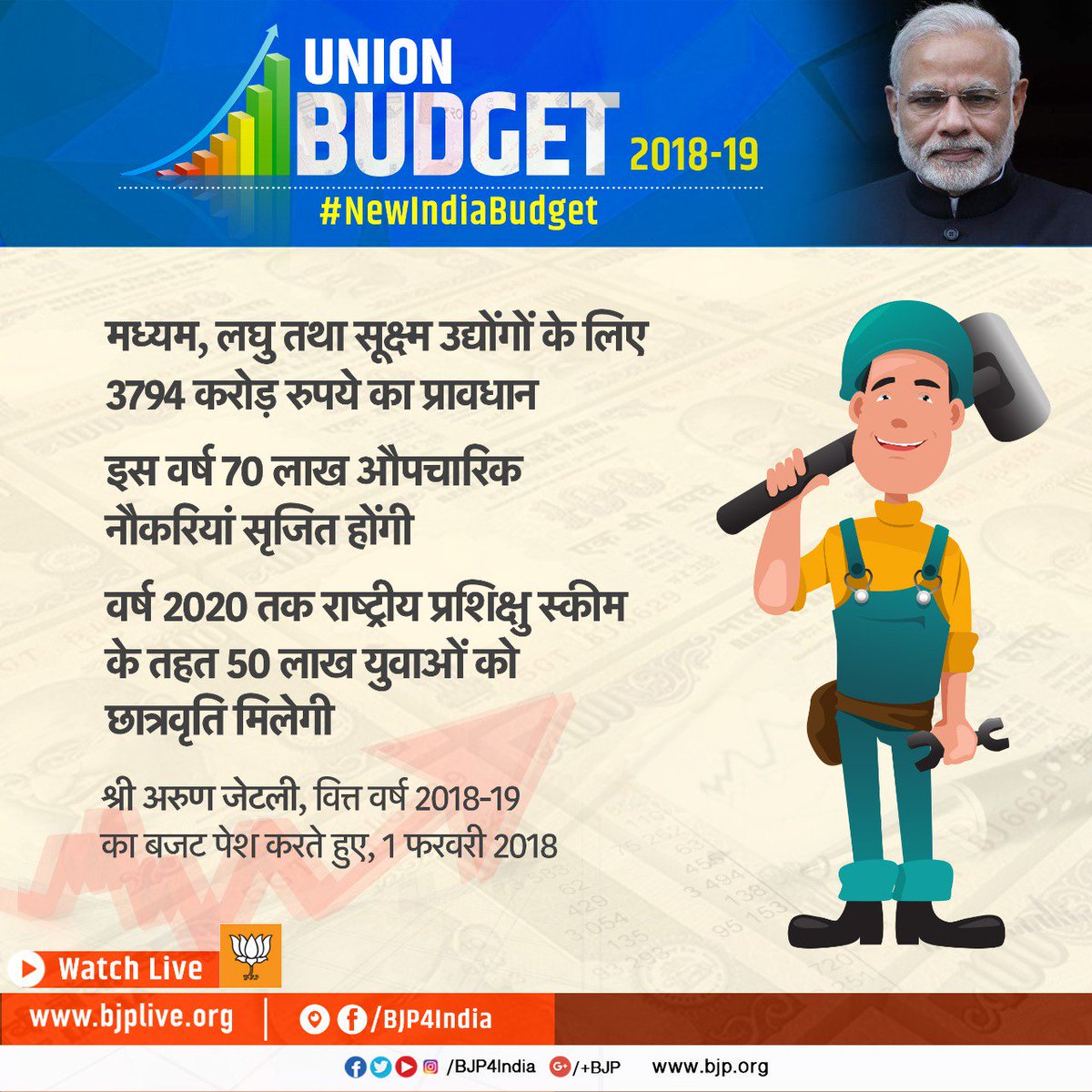 • इस वर्ष 70 लाख औपचारिक नौकरियां सृजित होंगी। • वर्ष 2020 तक राष्ट्रीय प्रशिक्षु स्कीम के तहत 50 लाख युवाओं को छात्रवृति मिलेगी। • टैक्सटाइल सेक्टर के लिए 7,150 करोड़ रुपये का प्रावधान। • वित्त वर्ष 2019 तक मुद्रा योजना के लिए 3 लाख करोड़ रुपये के लोन बांटने का लक्ष्य।pic.twitter.com/jGa1KukxGN