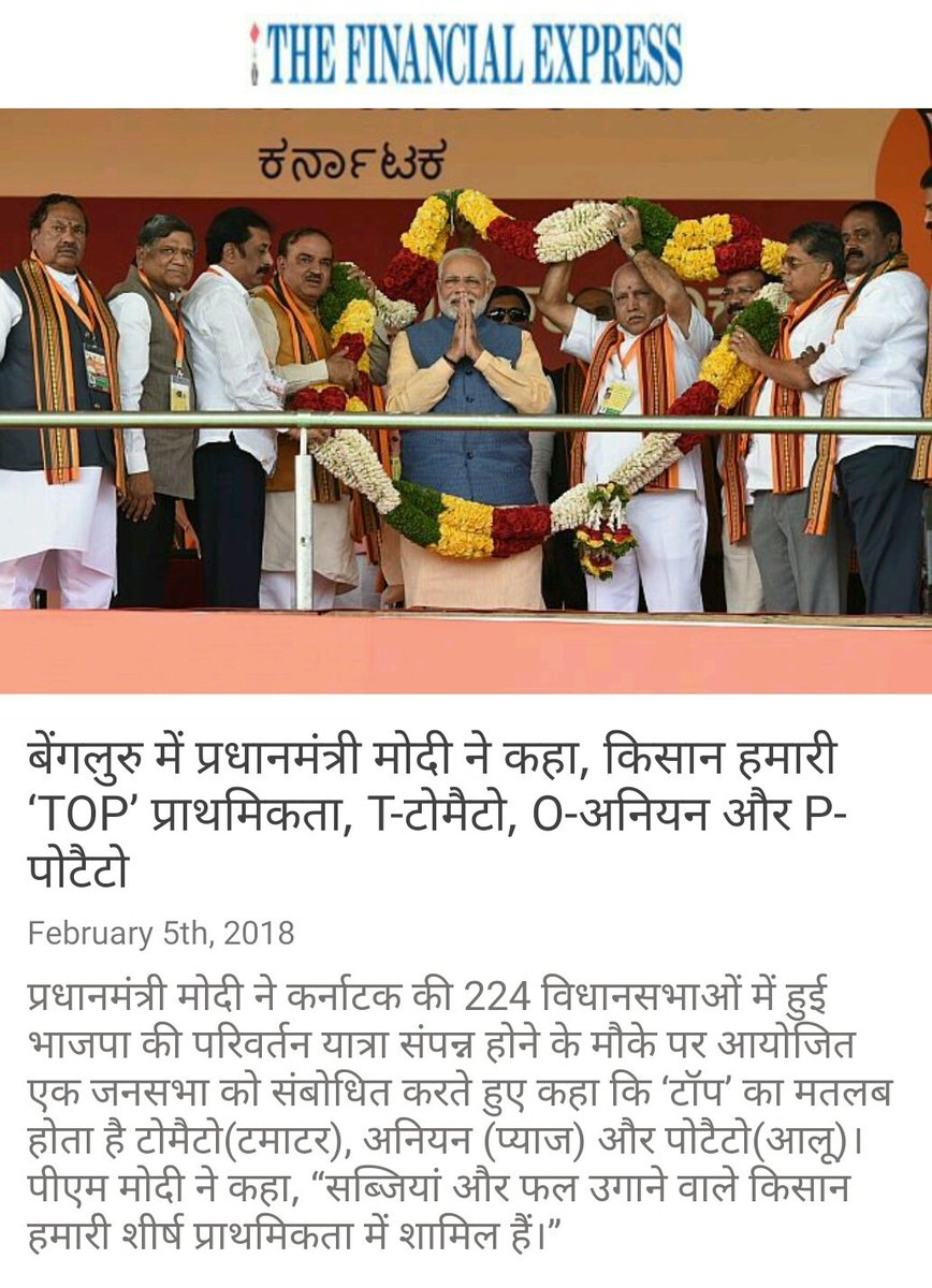 बेंगलुरु में प्रधानमंत्री मोदी ने कहा, किसान हमारी ‘TOP’ प्राथमिकता, T-टोमैटो, O-अनियन और P-पोटैटो http://www.financialexpress.com/india-news/top-priority-for-government-means-tomato-onion-and-potato-says-pm-narendra-modi/1051089/ … via NMApppic.twitter.com/sblTqFLVC4