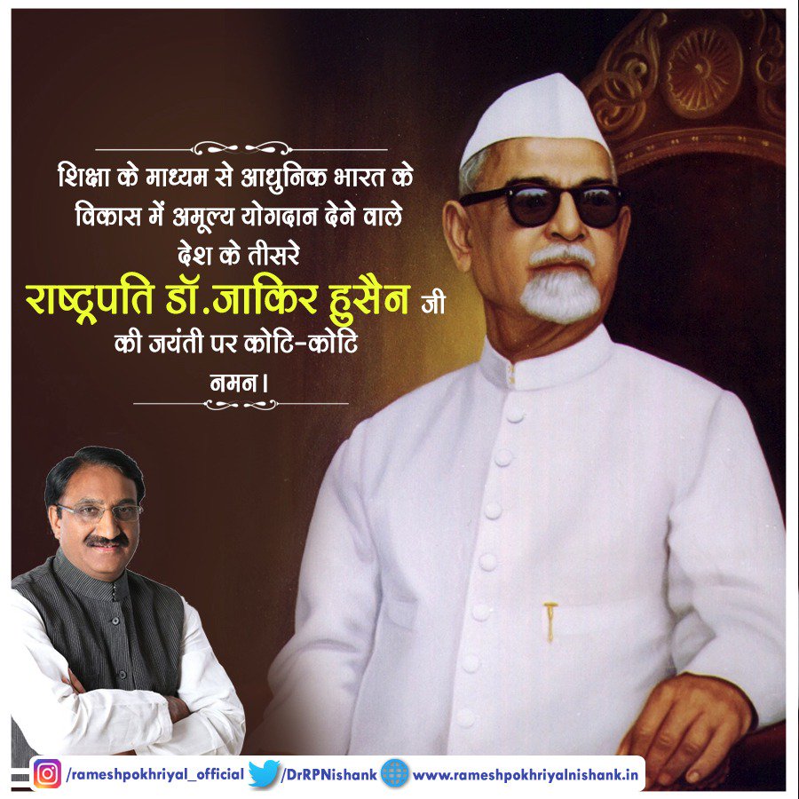 शिक्षा के माध्यम से आधुनिक भारत के विकास में अमूल्य योगदान देने वाले देश के तीसरे राष्ट्रपति डॉ ज़ाकिर हुसैन जी की जयंती पर कोटि-कोटि नमन।pic.twitter.com/mGpq65cpH0