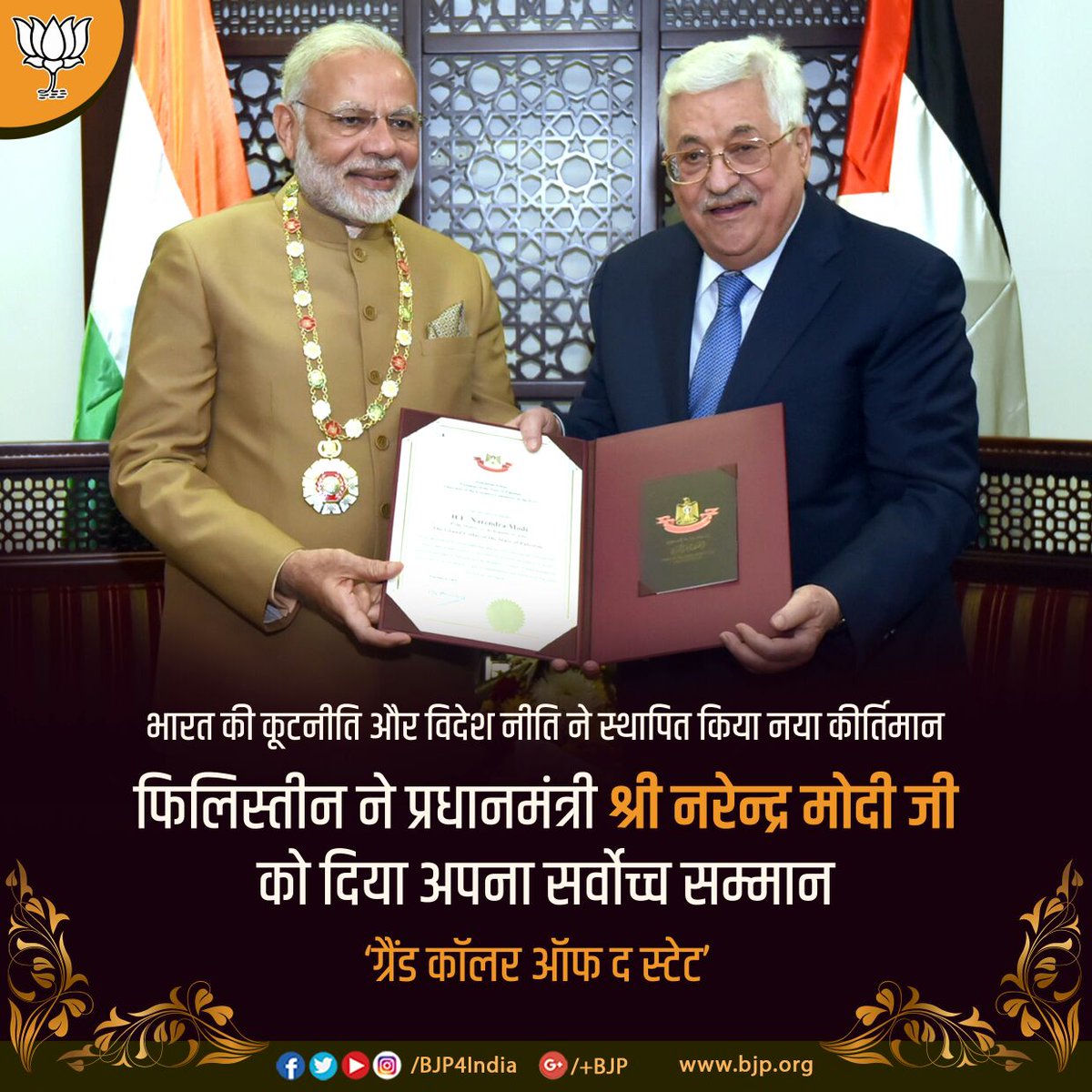 फिलिस्तीन के राष्ट्रपति महमूद अब्बास ने प्रधानमंत्री श्री नरेन्द्र मोदी जी को ‘ग्रैंड कॉलर ऑफ़ द स्टेट’ से सम्मानित किया। ‘ग्रैंड कॉलर’ विदेशी गणमान्यों - राष्ट्राध्यक्षों/शासनाध्यक्षों एवं समान पद के व्यक्तियों को दिया जाने वाला फिलिस्तीन का सर्वोच्च सम्मान है।pic.twitter.com/Gz6EpStb9P