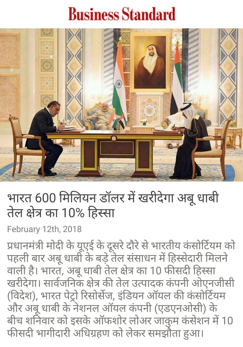 भारत 600 मिलियन डॉलर में खरीदेगा अबू धाबी तेल क्षेत्र का 10% हिस्सा http://www.business-standard.com/article/economy-policy/in-a-first-india-to-buy-10-stake-in-abu-dhabi-oil-fields-for-600-mn-118021100599_1.html … via NMApppic.twitter.com/emBDoSyKw8