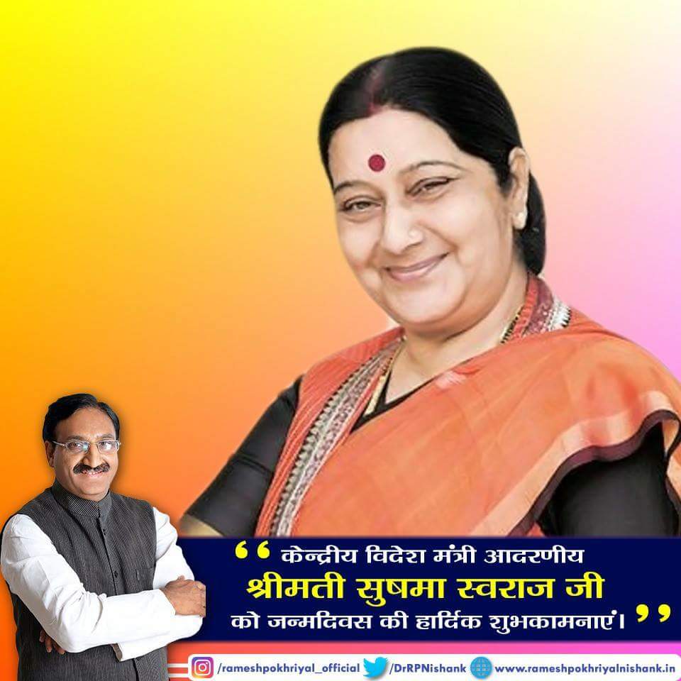 केंद्रीय विदेश मंत्री आदरणीय @SushmaSwaraj जी को जन्मदिन की हार्दिक शुभकामनाएं ।