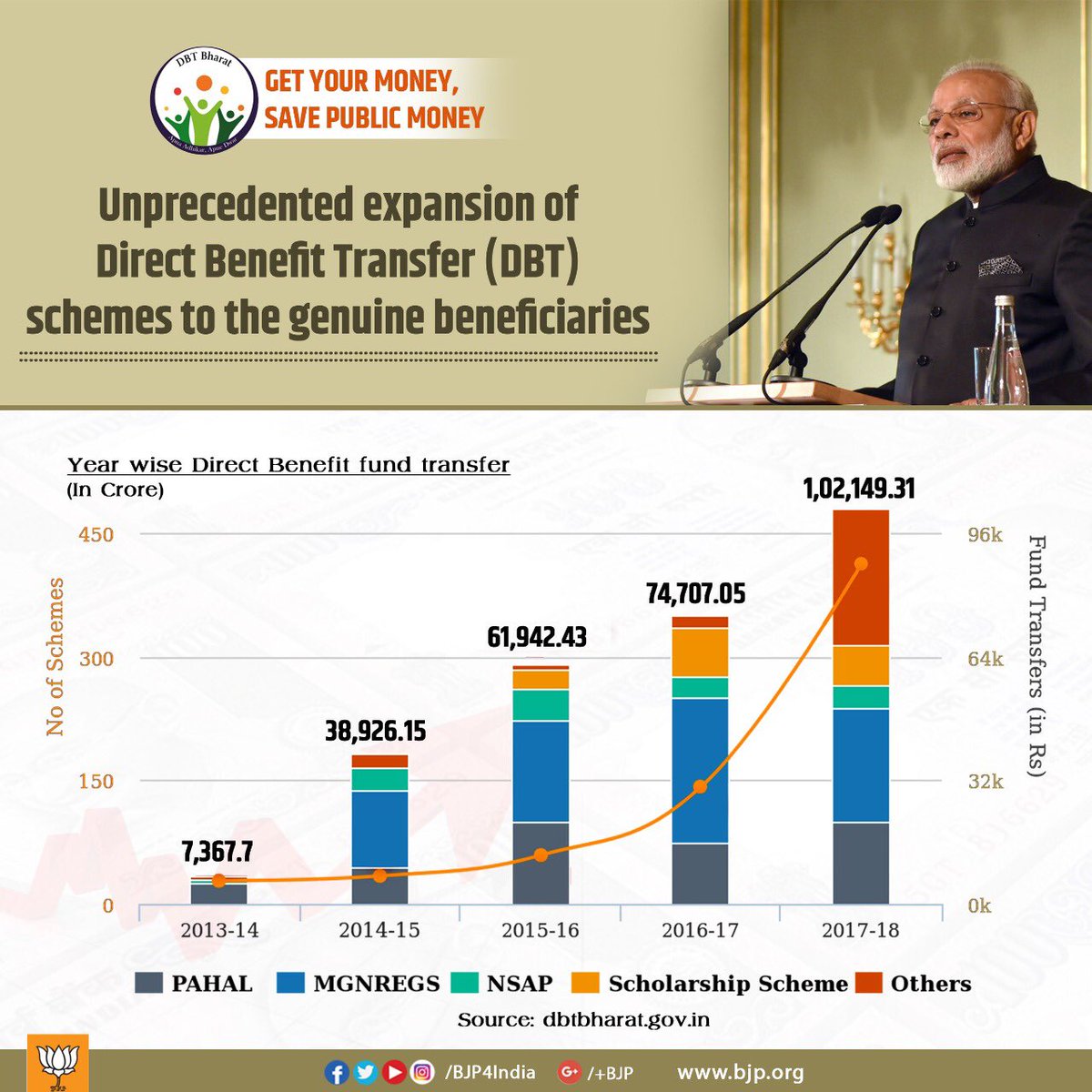 From Rs. 7,000 crore in 2013-14 to more than Rs. 1 lakh crore in 2017-18 till date, the funds transferred through direct benefit schemes have increased manifold under Modi government.pic.twitter.com/uYqErVIDQT