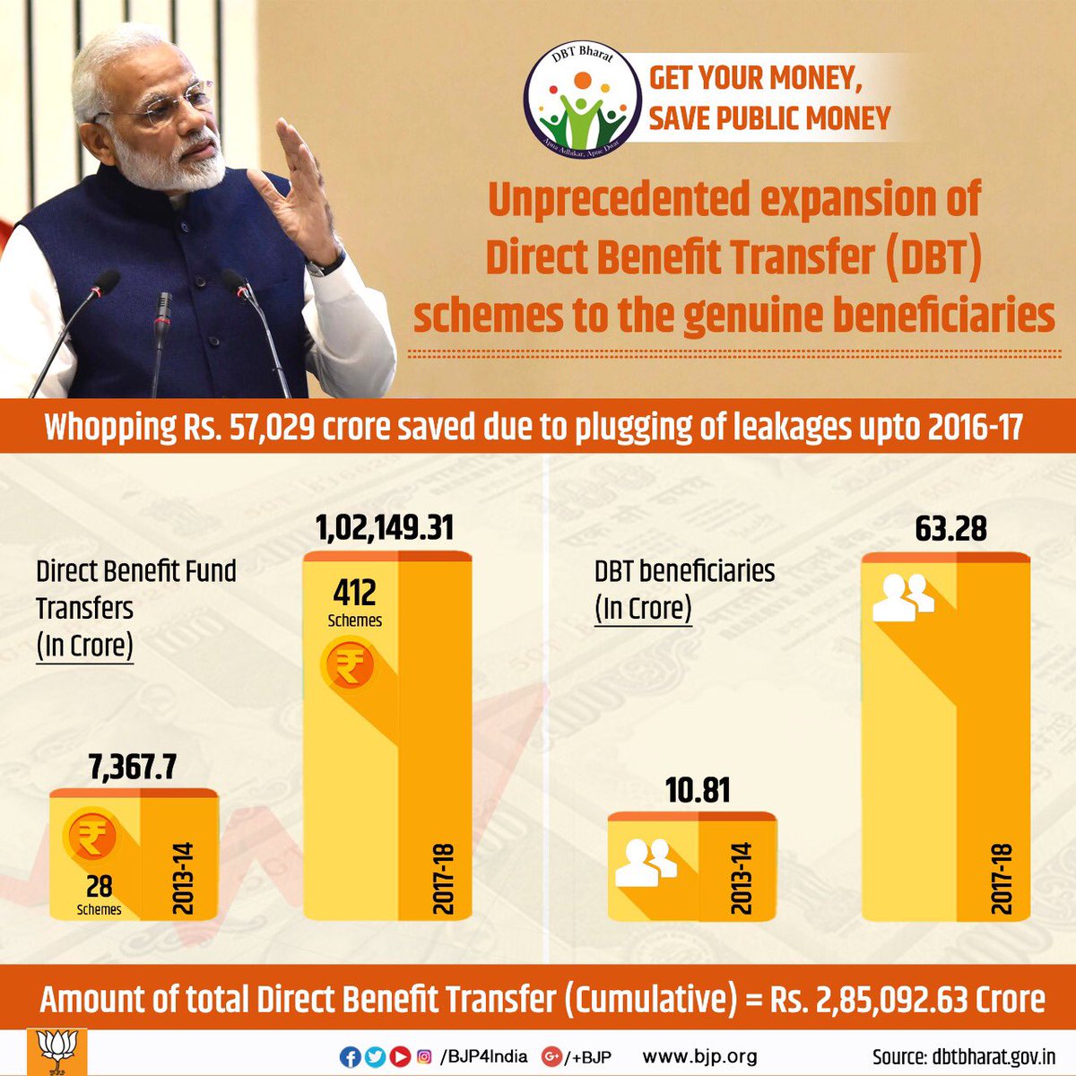 Unprecedented expansion of transparent and leakage-free DBT schemes has resulted in savings of whopping Rs. 57,029 crore of public money. Total number of beneficiaries covered has risen to more than 63 crore till date from just over 10 crore in 2013-14!pic.twitter.com/OI8LPHdaeR