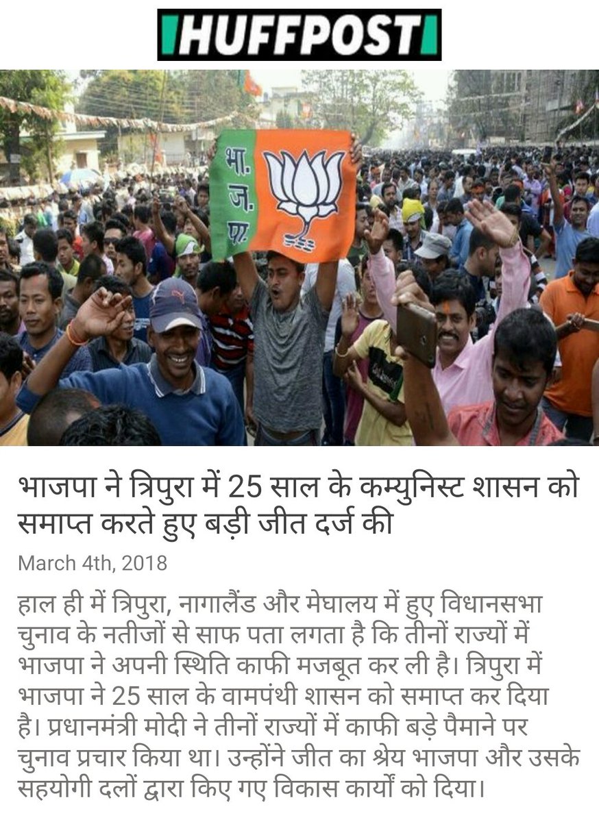 भाजपा ने त्रिपुरा में 25 साल के कम्युनिस्ट शासन को समाप्त करते हुए बड़ी जीत दर्ज की https://www.huffingtonpost.in/2018/03/03/bjp-ends-25-year-long-cpm-rule-in-tripura-with-a-massive-victory_a_23376232/ … via NMApppic.twitter.com/GURyYJRoWR